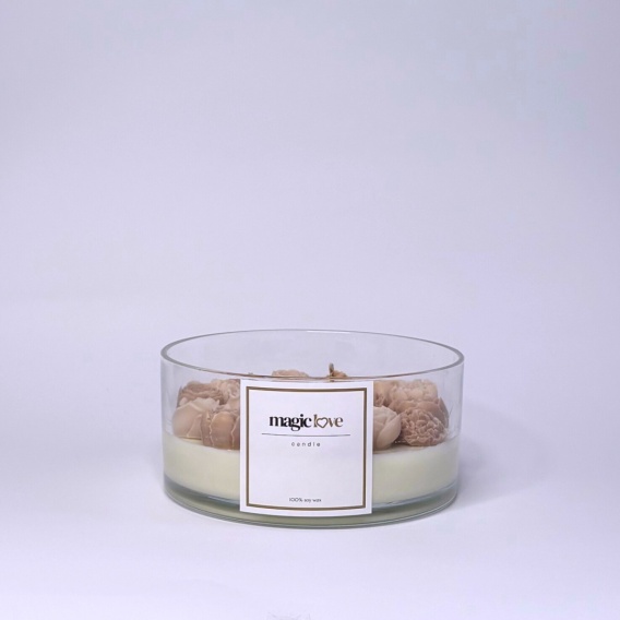 Subtelne, beżowe kwiatuszki z wosku dodają świecy elegancji i naturalnego uroku. Ich delikatny, neutralny kolor wprowadza spokój i harmonię do wnętrza, jednocześnie podkreślając klasyczny charakter świecy.