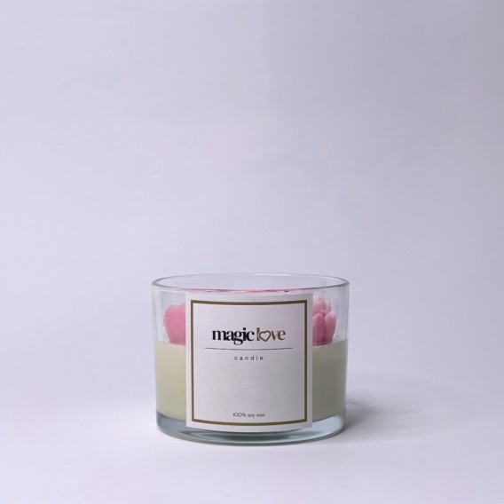 Różowe kwiatuszki z wosku wprowadzają do świecy nutę subtelnej romantyczności i ciepła. Ich kolor przywodzi na myśl wiosenne pąki kwiatów, świeżość i delikatną radość, nadając świecy uroczy i przyjemny charakter wizualny.