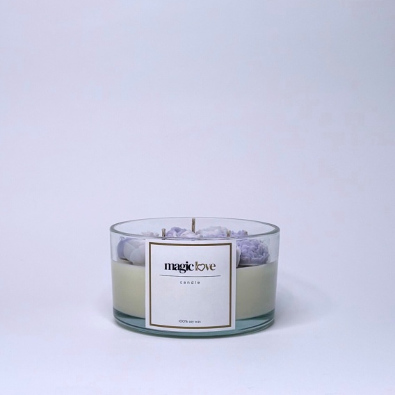 Fioletowe kwiatuszki z wosku dodają świecy elegancji i subtelnego uroku. Ich barwa symbolizuje spokój, równowagę i odrobinę tajemniczości, tworząc niezwykle harmonijny akcent wizualny. Każdy detal jest dopracowany, dzięki czemu świeca staje się małym artystycznym dziełem, przyciągającym wzrok i budzącym zachwyt.