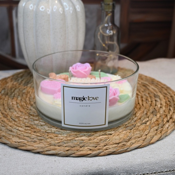 Duża świeca sojowa z napisem „Kochanej Babci” to wyjątkowa propozycja, która łączy w sobie symbolikę, estetykę i naturalne wykonanie. Na powierzchni wosku znajduje się dekoracyjny napis otoczony subtelnymi motylkami, małymi serduszkami oraz dwiema różami z delikatnymi listkami, tworząc harmonijną i pełną ciepła kompozycję.