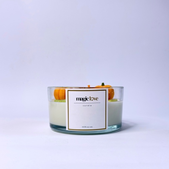 Świeca z kolekcji „Jesień” to ręcznie tworzona dekoracja i zapach w jednym – ozdobiona miniaturowymi dyniami, liśćmi i grzybkami z wosku, które zdobią jej powierzchnię niczym leśna kompozycja. Każda z nich to unikat, dopracowany w najmniejszym detalu.