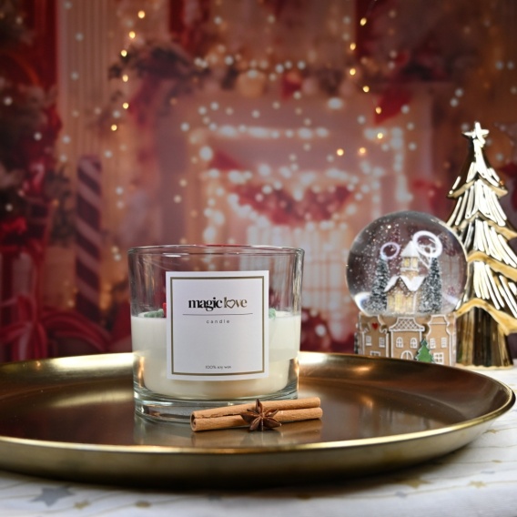 Wykonana z naturalnego wosku sojowego, pali się długo i czysto, uwalniając ciepły, świąteczny aromat, który wypełnia pomieszczenie spokojem i magią Bożego Narodzenia.