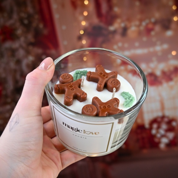 Ta niezwykła świeca została stworzona, by wprowadzić do wnętrza ciepło i magię Świąt Bożego Narodzenia. Umieszczona w eleganckim, przezroczystym szkle, zachwyca piękną kompozycją, w której główną rolę grają pierniczki z wosku – urocze, dopracowane w każdym detalu ozdoby, wyglądające jak prawdziwe ciasteczka.