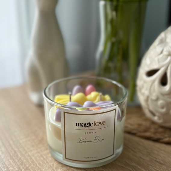 Świeca sojowa z uroczą wielkanocną dekoracją to wyjątkowy dodatek, który wprowadza do wnętrza wiosenną radość i świąteczny klimat. Na powierzchni naturalnego wosku znajdują się dwa urocze zajączki wykonane z wosku, otoczone małymi, kolorowymi jajeczkami wielkanocnymi. Delikatne detale i staranne wykonanie sprawiają, że świeca prezentuje się niezwykle subtelnie i przyciąga wzrok, stając się piękną ozdobą wielkanocnego stołu.