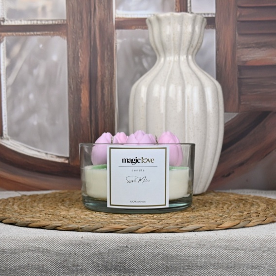 Elegancka świeca sojowa z subtelną dekoracją w postaci pięciu różowych tulipanów oraz delikatnych zielonych listków to połączenie naturalnego piękna i ponadczasowej estetyki. Jasna kompozycja nadaje świecy lekkości i sprawia, że doskonale wpisuje się w różne style wnętrz – od klasycznych po nowoczesne.
