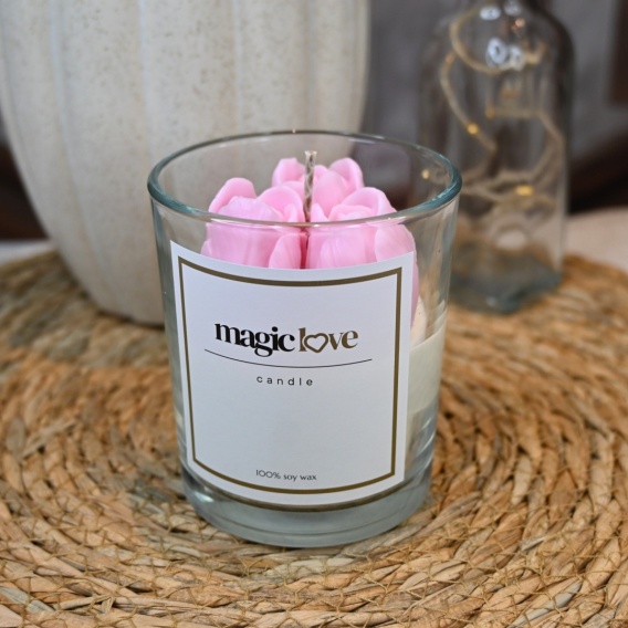 Świeca sojowa z trzema tulipanami z wosku to subtelna dekoracja, która zachwyca delikatnością i formą. Na powierzchni świecy znajdują się trzy różowe tulipany z wosku, symbolizujące harmonię, świeżość i budzącą się naturę. Każdy detal został dopracowany z największą starannością, dzięki czemu świeca nie tylko pięknie pachnie, ale również stanowi wyjątkową ozdobę wnętrza.
