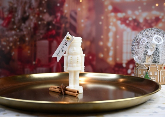 Ta wyjątkowa świeca to prawdziwe świąteczne dzieło sztuki! Wykonana z naturalnego wosku sojowego, ma formę klasycznego dziadka do orzechów – symbolu Bożego Narodzenia i świątecznej magii. Utrzymana w naturalnym, białym kolorze, ozdobiona złotym brokatem na guziczkach, prezentuje się elegancko i z nutą bajkowego uroku.